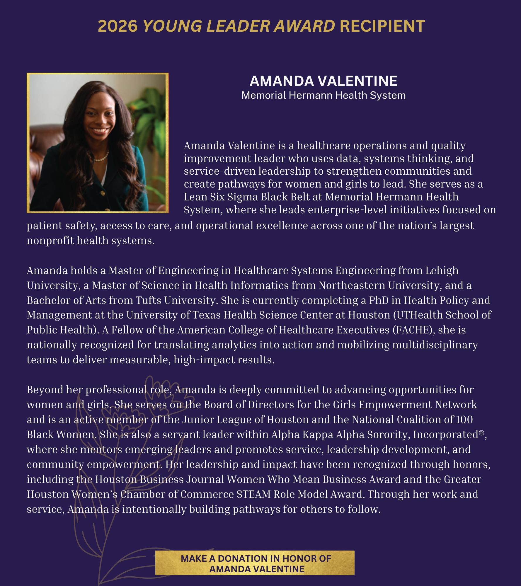 Amanda Valentine is a healthcare operations and quality improvement leader who uses data, systems thinking and service-driven leadership to strengthen communities and create pathways for women and girls to lead. She serves as a Lean Six Sigma Black Belt at Memorial Hermann Health System, where she leads enterprise-level initiatives focused on patient safety, access to care and operational excellence across one of the nation’s largest nonprofit health systems. She serves on the board of directors for the Girls Empowerment Network and is an active member of the Junior League of Houston and the National Coalition of 100 Black Women. Valentine is a servant leader within Alpha Kappa Alpha Sorority, Incorporated®. She has received the Houston Business Journal Women Who Mean Business Award and the Greater Houston Women’s Chamber of Commerce STEAM Role Model Award. She holds a Master of Engineering in Healthcare Systems Engineering from Lehigh University, a Master of Science in Health Informatics from Northeastern University, and a Bachelor of Arts from Tufts University. She is completing a Ph.D. in Health Policy and Management at the University of Texas Health Science Center at Houston.