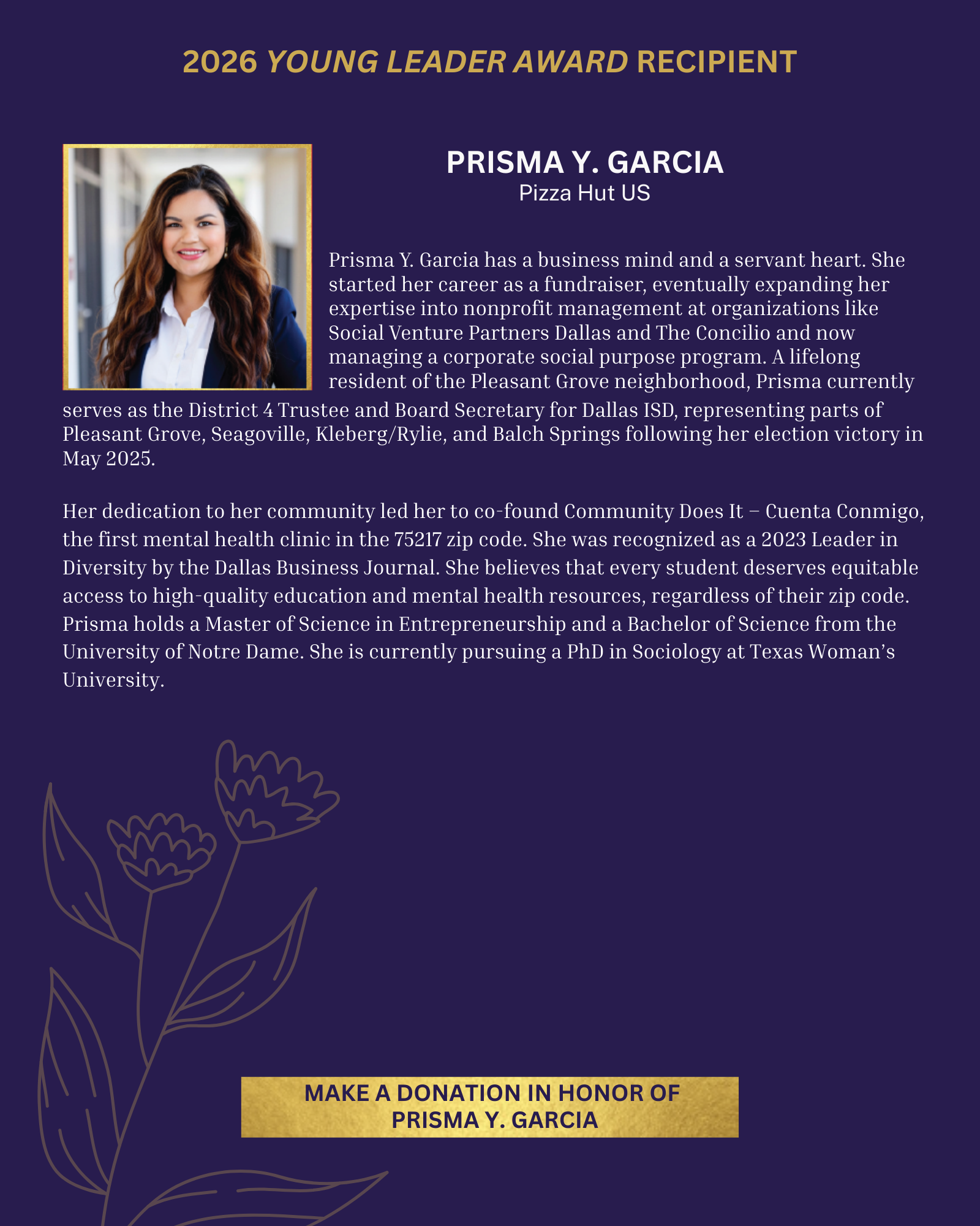 Prisma Y. Garcia has a business mind and a servant heart. She started her career as a fundraiser, eventually expanding her expertise into nonprofit management at organizations like Social Venture Partners Dallas and The Concilio and now managing a corporate social purpose program. A lifelong resident of the Pleasant Grove neighborhood, Garcia currently serves as the District 4 Trustee and Board Secretary for Dallas ISD, representing parts of Pleasant Grove, Seagoville, Kleberg/Rylie and Balch Springs following her election victory in May 2025. Her dedication to her community led her to co-found Community Does It – Cuenta Conmigo – the first mental health clinic in the 75217 zip code. She was recognized as a 2023 Leader in Diversity by the Dallas Business Journal. She believes that every student deserves equitable access to high-quality education and mental health resources, regardless of their zip code. Garcia holds a Master of Science in Entrepreneurship and a Bachelor of Science from the University of Notre Dame. She is currently pursuing a Ph.D. in sociology at Texas Woman’s University.